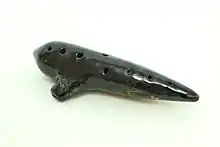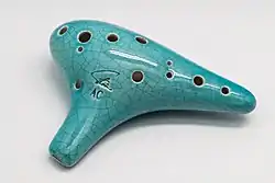 The ocarina is a wind musical instrument; it is a type of vessel flute.[1] Variations exist, but a typical ocarina is an enclosed space with four to twelve finger holes and a mouthpiece that projects from the body. It is traditionally made from clay or ceramic, but other materials are also used, such as plastic, wood, glass, metal, or bone.