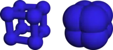 Octaazacubane /ˌɒktəˌeɪzəˈkjuːbeɪn/ is a hypothetical explosive allotrope of nitrogen with formula N8, whose molecules have eight atoms arranged into a cube. (By comparison, nitrogen usually occurs as the diatomic molecule N2.) It can be regarded as a cubane-type cluster, where all eight corners are nitrogen atoms bonded along the edges.[2] It is predicted to be a metastable molecule, in which despite the thermodynamic instability caused by bond strain, and the high energy of the N–N single bonds, the molecule remains kinetically stable for reasons of orbital symmetry.[3]