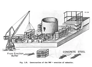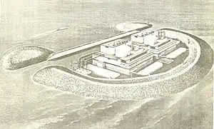 The power plants would be built with two reactors on a man-made island constructed of steel, anchored in the Atlantic a few miles off the coastline. The islands would be protected by a massive concrete breakwater composed of 18,000 dolosses, each weighing 80 tons,[1] designed to withstand hurricanes, tornadoes, moderate earthquakes and collision by a loaded tanker. The actual power plant would be towed, like a barge, by ocean tugboats to its destination.[5]
