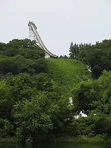 - Moving the tower was repeated a third time in 1955 when the tower was moved to Eau Claire, Wisconsin and erected at Hendrickson Hill along the Chippewa River in what is now the University of Wisconsin–Eau Claire Campus.[14] In 1968-69 Hendrickson Hill the hill was abandoned and the steel tower was once again dismantled and reassembled in its new location at Silver Mine Hill, 4.5 miles (7.2 km) downstream on the Chippewa River. The ski jump is still used at this site.[15]