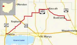 State Route 197 (SR 197) is 25.28-mile (40.68 km) east–west state highway in the western part of the U.S. state of Ohio. The western terminus of SR 197 is at a signalized intersection in downtown Celina that marks the junction of U.S. Route 127 (US 127), SR 29 and SR 703. SR 197 has its eastern terminus at SR 198 nearly 2 miles (3.2 km) southeast of the village of Buckland.