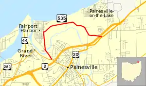State Route 535 (SR 535) is an east–west state highway in the northeastern portion of the U.S. state of Ohio. The western terminus of State Route 535 is at a signalized intersection with State Route 283 in the northwestern portion of Painesville, and just north of State Route 283's interchange with State Route 2. The route’s eastern terminus is at a signalized T-intersection with U.S. Route 20 about 1.25 miles (2.01 km) northeast of Painesville.