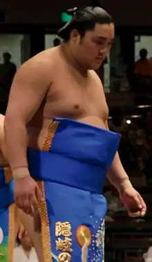Following the January tournament in 2015 he was promoted to sekiwake from the relatively low rank of maegashira 6, benefiting from the failure of most of those ranked directly above him to get winning records. He was the first sekiwake from Shimane Prefecture in 121 years.[3] He was injured in his sekiwake debut and had to withdraw from the tournament. Nine wins in May and eleven in July 2015 saw him promoted to the san'yaku ranks for the fourth time (three at komusubi, and one at sekiwake). He was unable to hold the rank, scoring 6–9, and he also had a losing record in his fourth attempt at komusubi in May 2016. He picked up a kinboshi from maegashira 2 in July 2016, and had a very successful start to the September tournament, defeating ōzeki Kisenosato on opening day, Kakuryū on Day 2 and Harumafuji on Day 3. By the sixth day he had defeated two yokozuna and three ozeki and was the undefeated tournament co-leader.[4] However he began losing in the second week of the tournament and finished on 9–6. He was rewarded for this efforts with his first Outstanding Performance Prize,[5] and promotion back to sekiwake.