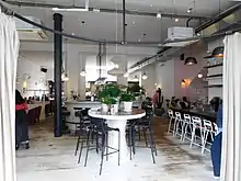 The old fire station was then used as a restaurant, first, with the name of building obscured, by All Bar One until 2016, and then by Darwin & Wallace.[5] Their refurbishment, under the architects Box 9 Design and Red Deer,[6] revealed the masonry carving of the building's original name, and they decided to run their business under the name of 'No. 197 Chiswick Fire Station'.[5] The restaurant has both indoor and outdoor dining, the latter in a "forgotten courtyard".[7] The restaurant is furnished with chairs made by The French House, tiles by Bert and May, and artworks chosen by The Hang Up Gallery.[8] It won the 'Pub' category in the Restaurant & Bar Design Awards, 2017.[9]