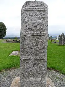 The "decorated high cross" has four illustrated faces, with a range of panels. It did not survive intact – it is known that it was leaning by 1862, and later lay on the ground for some years, and when it was remounted in the late 19th century, parts of at least one panel were lost, and parts of the panel which had been facing upwards had been badly eroded.