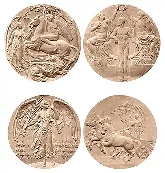 1908 London, Great Britain Obverse: An athlete receiving a laurel crown from two female figures