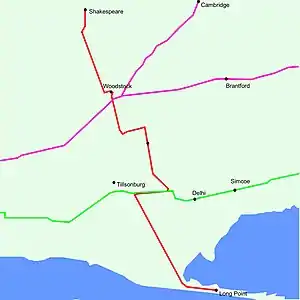 King's Highway 59, commonly referred to as Highway 59, was a provincially maintained highway in the Canadian province of Ontario. It connected Long Point Provincial Park in Norfolk County to the town of Shakespeare in Perth County, passing through the city of Woodstock in Oxford County en route. Several smaller towns also lined the highway, notably Courtland, Delhi, Norwich and Tavistock. Highway 59 featured junctions with Highway 3, Highway 2, Norfolk County Highway 24 and the concurrent routes of Highway 7 and Highway 8. Highway 59 also had an interchange with Highway 401.