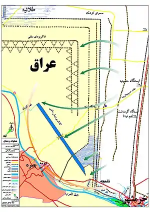 Iraq had suffered enormously from the loss. Only a third of Iraq's air force remained intact, but the remaining Iraqi ground forces stayed on the alert, as Iran amassed a number of its troops to the east of Basra, just across the border.[6] In the years prior, Saddam Hussein took the precautions for an Iranian invasion by stationing large numbers of his forces along the borders. Though demoralized due to their recent defeats, the armies of Iraq enjoyed better supplies, training, and information than their Iranian counterparts. The Iraqis also constructed a detailed plan of earthworks and trenches, followed by mine-fields with machine gun, artillery positions and dug-in tanks.[6]