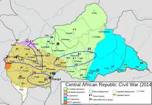 In late 2012, President François Bozizé requested international aid from France and the US to fend off the Séléka, a rebel movement that had progressed to the vicinity of the capital Bangui.[7][8][9] The Séléka is a Muslim and Northern movement fighting the Catholic South.[10] In March 2013, Michel Djotodia ousted Bozizé from power and became the first Muslim President of the country.[11][12]