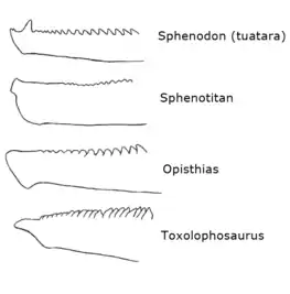 Opisthodonts lacked dental regionalization, meaning that all of their teeth had the same form and they did not have caniform or hatchling teeth like other sphenodonts.[2] Despite having had thicker enamel to resist wearing down their teeth, opisthodonts have often been found with their teeth significantly worn away, especially towards the front of the jaw.[1] The tip of the lower jaw is completely toothless in opisthodonts. Their jaws were also deep (particularly in eilenodonts) to counter stresses which would have occurred during food processing.[1]