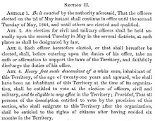 In the preamble this "temporary government" was intended to exist "until such time as the United States of America extend their jurisdiction over us."[11] The articles of the first Section were from the 14th section of the Northwest Ordinance, with minor modifications.[11][12] The first three articles were identical to the Ordinance, outside of a change related to relations with Indigenous peoples. Wars against the natives were to be commenced by "representatives of the people" instead of the Congress.[11][12] The fourth and final article was from the sixth article of the Ordinance, banning slavery outside use as a punishment. The portion of the sixth article related to restitution of runaways to slave states was not included in the Organic Laws.[11][12]