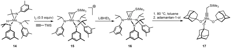 Molybdenum neopentylidyne complexes endowed with sterically demanding phenolates or branched fluorinated alkoxides are catalysts for alkyne metathesis.[11] However, preparation of these catalysts is problematic by the standard Schrock procedure. The trisalkoxide species 17 is active at room temperature.[12]