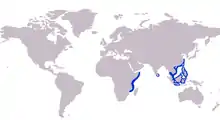The oriental trumpeter whiting has a wide distribution, inhabiting many areas of the Indo-Pacific region. The westernmost sighting of the species was in Delagoa Bay, South Africa, with its range extending up the east African coast and to the West Indies, but it has never been recorded near the Indian mainland. The species is most prolific in the Southeast Asian region, with positive identifications from Singapore, Hong Kong, Philippines, Thailand, Malaysia, Indonesia, Taiwan[6] and up to Japan. S. aeolus has also never been recorded in New Guinea or Australia.[4]