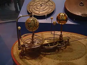 There is an orrery built by clock makers George Graham and Thomas Tompion dated c. 1710 in the History of Science Museum, Oxford.[13] Graham gave the first model, or its design, to the celebrated instrument maker John Rowley of London to make a copy for Prince Eugene of Savoy. Rowley was commissioned to make another copy for his patron Charles Boyle, 4th Earl of Orrery, from which the device took its name in English.[14][15] This model was presented to Charles' son John, later the 5th Earl of Cork and 5th Earl of Orrery. Independently, Christiaan Huygens published in 1703 details of a heliocentric planetary machine which he had built while living in Paris between 1665 and 1681. He calculated the gear trains needed to represent a year of 365.242 days, and used that to produce the cycles of the principal planets.[9]