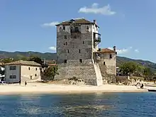 - The Byzantine Tower of Ouranoupoli (also known as Prosfori, or "The Offering") was built by Emperor Andronikos II Palaiologos during the 13th century, who placed it under the jurisdiction of Vatopedi Monastery. However, in 1922, the Greek government confiscated the area from the monastery to accommodate Greek refugees from Turkey during the population exchange between Greece and Turkey. In 1928, Sydney Loch and his wife Joice NanKivell Loch moved into the tower, where they maintained a presence for decades as they used it as an important meeting place for both monks and laymen passing to and from Mount Athos. The Lochs also owned a carpet-weaving enterprise in Ouranoupoli, employing many locals.[6]
