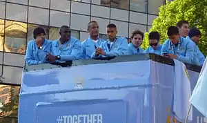 On 31 August 2011, City confirmed that they had signed Hargreaves on a one-year deal.[49] It was expected Hargreaves would join West Bromwich Albion,[50] but the City offer came as a surprise.[51] The move offered Hargreaves an opportunity for Champions League football as the club looked to challenge United for the Premier League. However, he was left out of the Champions League squad. Hargreaves made his City debut against Birmingham City in the League Cup, and opened the scoring in a 2–0 victory with a goal in the 17th minute.[52] On 27 April 2012, it was confirmed that he would be released at the end of the season after just four appearances for the club.[53] City were to be victorious in the Premier League, winning their first English title for 44 years, with Hargreaves being involved in the on-pitch celebrations after defeating Queens Park Rangers on the final day. However, after only playing one league match all season, he did not qualify to receive a winner's medal.