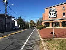Pennsylvania Route 722 (PA 722) is an 8.8-mile-long (14.2 km), east–west state highway located in central Lancaster County, Pennsylvania. The western terminus is at an interchange with PA 283 in East Hempfield Township, where State Road continues westward toward Harrisburg Pike turning into Centerville Road upon crossing. The eastern terminus is at PA 272 in Oregon. PA 722 is a two-lane undivided road that passes through suburban areas to the north of Lancaster. The route intersects PA 72 in East Petersburg and forms a concurrency with PA 501 in Neffsville.