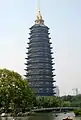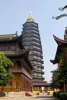 The Tianning Temple (simplified Chinese: 天宁寺; traditional Chinese: 天寧寺; pinyin: Tiānníng Sì; Wu: Thieninzy), is a Buddhist temple located in Changzhou City, Jiangsu Province, China, is noted for its giant pagoda, the Tianning Pagoda (天宁宝塔/天寧宝塔). Construction began in April 2002 with the opening ceremony for the completed structure held on April 30, 2007, where a crowd of hundreds of Buddhist monks gathered for the ceremony.[1][2] With 13 stories and a height of 153.79 metres (505 ft), this is now the tallest pagoda in the world,[1][2][3] taller than China's tallest existent pre-modern Buddhist pagoda, the Liaodi Pagoda built in 1055 at a height of 84 m (275 ft). Although the existing pagoda was built by April 2007, the temple grounds and the pagoda have a history of construction and destruction for the past 1,350 years, since the time of the Tang dynasty (618907).[1][2][3] Building of the pagoda was proposed by the Buddhist Association of China in 2001, yet providing money donations for the temple was an international effort, as leaders of 108 Buddhist associations and temples worldwide attended the opening ceremony at the temple.[3]