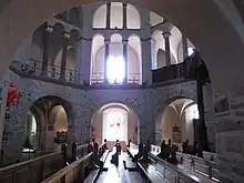Several buildings used by the clerics of the chapel were arranged in the shape of a latin cross: a curia in the East, offices in the North and South, and a projecting part (Westbau[21]) and an atrium with exedrae in the West. But the center piece was the chapel, covered with a 16,54 meters wide and 31 meters high octagonal cupola.[22][23] Eight massive pillars receive the thrust of large arcades. The nave on the first floor, located under the cupola, is surrounded by an aisle; here stood the Palace servants.[24]