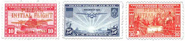 Trippe decided to start a service from San Francisco to Honolulu and on to Hong Kong and Auckland following steamship routes. After negotiating traffic rights in 1934 to land at Pearl Harbor, Midway Island, Wake Island, Guam, and Manila,[34] Pan Am shipped $500,000 worth of aeronautical equipment and construction crews westward in March 1935 using the S.S. North Haven, a 15,000-ton merchant ship chartered for the purpose of provisioning each island that the clippers would stop at on their 4- to 5-day flight.[35] Pan Am ran its first survey flight to Honolulu in April 1935 with a Sikorsky S-42 flying boat.[36] Construction crews, including Bill Mullahey who would later oversee Pan Am's Pacific operations, cleared coral from lagoons, constructed hotels, and installed the radio navigation equipment necessary for the clippers to island hop from Pearl City Seaplane Base, Hawaii, to Asia.[37] The airline won the contract for a San Francisco–Canton mail route later that year and operated its first commercial flight carrying mail and express (no passengers) in a Martin M-130 from Alameda to Manila amid media fanfare on November 22, 1935. The five-leg, 8,000-mile (13,000 km) flight arrived in Manila on November 29 and returned to San Francisco on December 6, cutting the time between the two cities by the fastest scheduled steamship by over two weeks.[38] (Both the United States and Philippine Islands issued special stamps for the two flights.) The first passenger flight left Alameda on October 21, 1936.[7] The fare from San Francisco to Manila or Hong Kong in 1937 was US$950 one way (about $19340 in 2022) and US$1,710 round trip.[39]