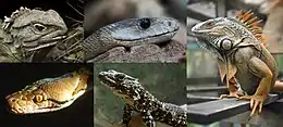 | Collage of five lepidosaurs. From top left to right: Sphenodon punctatus, Dendroaspis polylepis, Iguana iguana, Smaug breyeri and Malayopython reticulatus. | |
