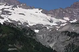 Paradise Glacier is a glacier on the southeast flank of Mount Rainier in Washington. It covers 0.4 square miles (1.0 km2) and contains 0.8 billion ft3 (23 million m3) with Stevens Glacier included.[1] The glacier is bounded to the west by the Muir Snowfield, Anvil Rock and McClure Rock. There is a single extant main lobe of the glacier, ranging from 9,000 feet (2,700 m) to 7,200 feet (2,200 m), that is connected to the larger Cowlitz Glacier.[2] To the south, there was a smaller portion which was near the Cowlitz Rocks and the tiny Williwakas Glacier, ranging from 6,900 feet (2,100 m) to 6,400 ft (2,000 m) in elevation and containing the Paradise Ice Caves until the 1990s.[2][3] This smaller lobe melted between 2004 and 2006.[4] Meltwater from the glacier drains into the Cowlitz River.[1]