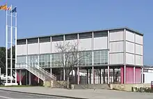 The Finnish pavilion was designed by Alvar Aalto, following an open architectural competition held in 1936, where he had won both first and second prize, the winning entry "Le bois est en marche" forming the basis for the pavilion as built. Finland had been given a difficult, sloping wooded site near the Trocadéro, something which Aalto was able to exploit in creating a ground plan featuring an irregular chain of volumes joined in as sort of collage - with small, open, cubic pavilions together with two larger exhibition halls.[4] The entire complex curved around a shady garden with Japanese touches. The pavilion was also an advertisement for Finland's prime export, wood, as the building was built entirely of timber. French architecture historian Fabienne Chevallier has argued that at the time French critics were baffled by Aalto's building because though built of wood - and thus endorsing an image of what they perceived Finland to be - they were unprepared for Aalto's avant-gardism.[5]
