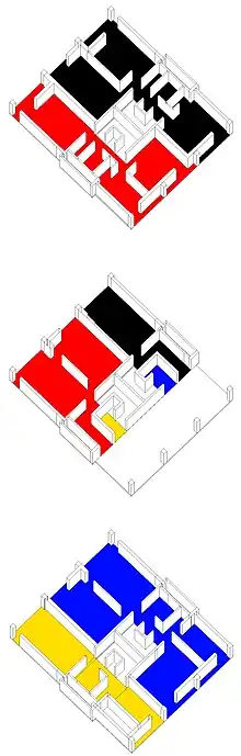 The site is steeply sloping (gradient 1 in 10), enabling the designers to maintain a constant roof level though the buildings ranged from four to 13 storeys. There were access roadways 10 feet (3.0 m) on every third storey; these serviced a one-storey flat beneath and a two-storey maisonette on that level and on the level above. The horizontal design repeated itself every three bays, centred on a H-frame that carried the services and stair columns. Each of these units contained a one-bedroom flat, a two-bedroom flat, a two-bedroom maisonette and a three-bedroom maisonette, and stair columns. The kitchens and bathrooms were vertically aligned, allowing simple ducting for services and the Garchey waste disposal system.[21]