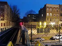 During 1905–1906, this portion of the line was rebuilt as a raised elevated railway and embankment structure,[3] and a new station was built at this location, with a single floor-level island platform and a station house between the tracks. The new station was located with the station house over Park Place and the platform extending north from that point.