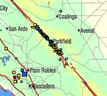 35.815°N 120.374°W Parkfield earthquake is a name given to various large earthquakes that occurred in the vicinity of the town of Parkfield, California, United States. The San Andreas fault runs through this town, and six successive magnitude 6 earthquakes occurred on the fault at unusually regular intervals, between 12 and 32 years apart (with an average of every 22 years), between 1857 and 1966.[1] The most recent significant earthquake to occur here happened on September 28, 2004.