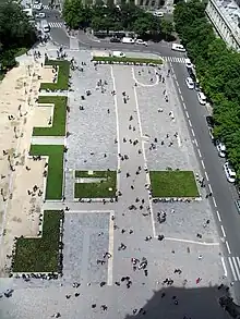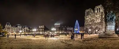 During the 1853 to 1870 renovation of Paris by Baron Haussmann, many buildings on the Île de la Cité were demolished, including all the buildings between the rue de la Cité and the rue d'Arcole. Between 1867 and 1878, the current Hôtel-Dieu building to the north of the square was built, and the hospital's old building to the south was demolished, at which point the parvis took on its current size and shape.[4] The expansion of the parvis was intended to better display Notre-Dame's architecture. Although the change was not without its drawbacks, as American authors Richard and Clara Winston noted "Something has been gained, something lost, by the creation of the vast open square in front. Distance diminishes size but provides a greater sense of the graciousness of the whole."[5]
