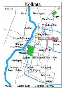 The Ghosh family came to Pathuriaghata from Keshpur at the time of Warren Hastings. It is said that Warren Hastings and his wife visited the Ghosh family.[10] Khelat Chandra Ghosh (1829-1878), grandson of Hasting’s banyan (clerk) Ramlochan Ghosh, moved out of the old family house at 46 Pathuriaghata Street to a new house at 47 Pathuriaghata Street. The family made a substantial contribution in music and charity. There is a lane named after him in Ward No. 24 (not shown in the map alongside). The lineage at 47 Pathuriaghata Street was Babu Khelat Ghosh, Babu Romanath Ghosh, Babu Siddheswar Ghosh (who patronized the famous Author Bibhuti Bhushan Bandopadhyay) and his brother Babu Aukhoy Ghosh. Presently the All Bengal Music Conference is held at 47 Pathuriaghata Street and is patronized by Babu Pradeep Ghosh [11] This mansion is filled with marble sculptures, paintings, crystal chandeliers and other art objects. In the year 1849, Raycharan Ghosh (zamindar) moved out of Kolkata and thus another family tree of the Ghosh family found lineage. His son Upendranath Ghosh was the Attorney General for the Awadh district under the British India Empire. Upendranath's first son Lalit Kumar Ghosh unified the families back and constructed a mansion near Rashbehari Avenue in Kolkata and wanted to keep one of the oldest Durga Puja traditions in Kolkata alive by entrusting the sons of the family with the responsibility. The Durga Puja and its traditions continue to be followed by the current members of the family. Now the Durga Puja and its traditions continue to be followed by the sons of the family - Rajiv Ghosh(Tom), Soumik Ghosh (Jimmy) and Ronit Ghosh(Pip). The wife of former president of the Board of Control for Cricket in India and the International Cricket Council , Jagmohan Dalmiya, hails from this family. The lineage of this family is amongst the oldest in Calcutta and can be traced back to 13 generations on records.[12]