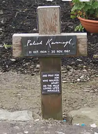 Kavanagh married his long-term companion Katherine Barry Moloney (niece of Kevin Barry) in April 1967 and they set up home together on Waterloo Road in Dublin.[6][7] Kavanagh fell ill at the first performance of Tarry Flynn by the Abbey Theatre company in Dundalk Town Hall and died a few days later, on 30 November 1967, in Dublin.[7] His grave is in Inniskeen adjoining the Patrick Kavanagh Centre. His wife Katherine died in 1989; she is also buried there.