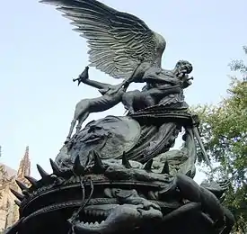 The sculpture depicts the struggle of good and evil, as well as a battle between the Archangel Michael and Satan. The sculpture also contains the Sun, the Moon, and several animals. Although it is called a fountain, there is currently no water on the site. A plaque at the base contains the following inscription: