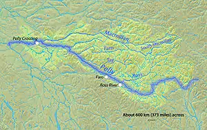 The Pelly River (Ts'ekínyäk Chú[1]) is a river in Canada, and is a headstream of the Yukon River. The river originates west of the Mackenzie Mountains and flows 530 km (330 mi) long through the south central Yukon. The Pelly has two main tributaries, the Ross and Macmillan rivers.