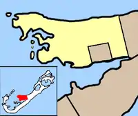 It occupies most of the short peninsula which juts from the central north coast of Bermuda's main island, and surrounds the city of Hamilton on three sides (the fourth being taken up by the shore of Hamilton Harbour). As such, its shape bears some passing resemblance to the county of Pembrokeshire in Wales. The peninsula juts into the eastern side of the Great Sound, the large expanse of water which dominates the geography of western Bermuda. In the east, Pembroke meets Devonshire Parish. As with most of Bermuda's parishes, it covers just over 2.3 square miles (about 6.0 km2 or 1500 acres). It had a population of 11,160 in 2016.[1]
