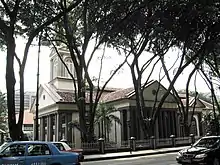 In the earliest plan of Singapore, Lieutenant Philip Jackson's 1822 Plan of Singapore, Bras Basah Road is shown as two separate roads. This map names the section between North Bridge Road and Beach Road as Church Street due to the presence of a Missionary Society chapel that stood at the corner of North Bridge Road and Bras Basah Road, while the section between North Bridge Road and Selegie Hill is named Selegy Street. Note however that the Jackson Plan is a proposal on how the road may be arranged, and the actual arrangement of the road at that time was different as shown in an actual map of 1825.[4] The road was also referred to as College Street in a lease granted by Thomas Stamford Raffles in 1823 for the Raffles Institution as it was the location of the Institution, but the name did not gain currency and was soon forgotten.[5] In an 1826 lease, the road was called Cross Road. The road appears on G.D. Coleman's 1836 Map of Singapore as Brass Bassa Road, the spelling used until the late 19th century when it was changed to Bras Basah.[5][6]