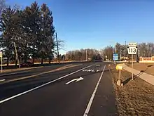 PA 113 begins at an intersection with US 30 Bus. (Lancaster Avenue) in the borough of Downingtown in Chester County, heading north on West Uwchlan Avenue, a two-lane divided highway. The road passes through residential areas and turns into a three-lane road with a center left-turn lane. The route crosses into East Caln Township and becomes a divided highway again as it reaches a partial interchange with the US 30 freeway, with access to westbound US 30 and from eastbound US 30. PA 113 becomes undivided again and continues northeast through wooded areas of homes with a few businesses as a three-lane road with two northbound lanes and one southbound lane that ascends a hill. The road narrows back to two lanes before it enters Uwchlan Township. PA 113 widens to four lanes as it continues through suburban areas, passing to the northwest of Downingtown East High School. The route heads to the north and gains a center left-turn lane as it runs through commercial areas in Lionville. PA 113 curves to the northeast again and crosses PA 100, where the name becomes East Uwchlan Avenue. Past this intersection, the road passes west of a park and ride lot and heads near industrial parks before it comes to a bridge over the Pennsylvania Turnpike (Interstate 76, I-76). The route passes near residential areas with some farmland before it crosses into West Pikeland Township.[2][3]