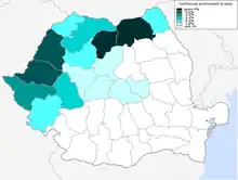 The Pentecostal Union of Romania (Romanian: Uniunea Penticostală din România) or the Apostolic Church of God (Romanian: Biserica lui Dumnezeu Apostolică) is Romania's fourth-largest religious body and one of its eighteen officially recognised religious denominations. At the 2021 census, some 404,000 Romanians declared themselves to be Pentecostals (2.1% of the population).[2] Ethnically, as of 2002, they were 85.2% Romanians, 10.6% Roma, 1.9% Ukrainians, 1.8% Hungarians and 0.5% belonged to other groups.[3] They have 1,343 churches, 7,879 affiliates and 354 pastors,[4][5] along with strong lay leadership.[6] The denomination originates in the early 1920s and, headed by a central leadership, is divided into nine regional communities: Arad, Braşov, Bucharest, Cluj-Napoca, Constanţa, Oradea, Oltenia-Argeş (Craiova), Maramureş-Sătmar (Baia Mare) and Suceava.[7] Membership is concentrated in Crişana, Banat and northern Moldavia.[4]