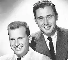 Aylesworth and Peppiatt relocated to the United States in 1958 and got work writing for The Andy Williams Show.[1] They had worked together on The Jimmy Dean Show and wondered why a show hosted by a country music star didn't feature the country music more prominently.[2] Aylesworth's 2010 book The Corn Was Green: The Inside Story of Hee Haw published by McFarland & Company told how he and Peppiatt came up with the idea for Hee Haw after seeing "country banter" between Charley Weaver and Jonathan Winters on The Jonathan Winters Show, and seeing that the shows atop the Nielsen ratings included The Andy Griffith Show, The Beverly Hillbillies, Gomer Pyle, U.S.M.C., Green Acres and Petticoat Junction, along with Rowan & Martin's Laugh-In and the duo conceived immediately of the format of country variety resulting in one of the longest-running series in television history, Hee Haw.[1][3] Originally a summer replacement for The Smothers Brothers Comedy Hour, Hee Haw was an immediate ratings winner throughout that first summer and was permanently added to the CBS schedule in December 1969.[2] Co-hosted by Roy Clark and Buck Owens, the hour-long program featured regulars Archie Campbell, Grandpa Jones, Minnie Pearl, Junior Samples, Lulu Roman and Canadians Gordie Tapp and Don Harron.[2][3] Comedian and frequent Peppiatt & Aylesworth collaborator Jack Burns was also a writer and major contributor in the early years of the show. There was also a spinoff sitcom "Hee Haw Honeys". One of the stars of the series was a young Christian music singer, Kathie Lee Johnson (Gifford) before she married Frank Gifford.