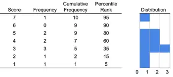 Percentile ranks are commonly used to clarify the interpretation of scores on standardized tests. For the test theory, the percentile rank of a raw score is interpreted as the percentage of examinees in the norm group who scored below the score of interest.[3][4]