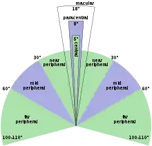 The inner boundaries of peripheral vision can be defined in any of several ways depending on the context. In everyday language the term "peripheral vision" is often used to refer to what in technical usage would be called "far peripheral vision." This is vision outside of the range of stereoscopic vision. It can be conceived as bounded at the center by a circle 60° in radius or 120° in diameter, centered around the fixation point, i.e., the point at which one's gaze is directed.[2] However, in common usage, peripheral vision may also refer to the area outside a circle 30° in radius or 60° in diameter.[3][4] In vision-related fields such as physiology, ophthalmology, optometry, or vision science in general, the inner boundaries of peripheral vision are defined more narrowly in terms of one of several anatomical regions of the central retina, in particular the fovea and the macula.[1]
