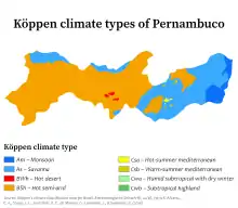 The inland region, called the sertão is high, stony, and dry, and frequently devastated by prolonged droughts (secas). The climate is characterized by hot days and cool nights. There are two clearly defined seasons, a rainy season from March to June, and a dry season for the remaining months.[7] The interior of the state is covered mostly by the dry thorny scrub vegetation called caatinga. The Rio São Francisco is the main water source for this area.