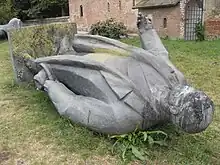 A 4.5 m (15 ft) bronze statue of Groza, placed on a red Carrara marble pedestal, was unveiled in Deva in 1962. The monument, designed by sculptor Constantin Baraschi, was removed in 1990, and replaced in 1999 by a statue of Trajan; in 2007, Groza's statue was transported to Băcia.[29] Another statue of him, sculpted by Romulus Ladea, was inaugurated in the Cotroceni neighborhood of Bucharest in 1971; this statue was taken down in 1990, and replaced in 1993 by a monument to the Artillery Heroes.[30] As of 2010, it lies in an open field near the Mogoșoaia Palace, next to a statue of Vladimir Lenin that used to be in front of Casa Scînteii.[31]