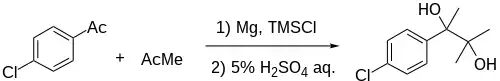 A mixed Pinacol coupling rxn between 4-chloroacetophenone [99-91-2] and acetone with magnesium activated with a small amount of trimethylsilyl chloride gave a 40% yield of phenglycodol.