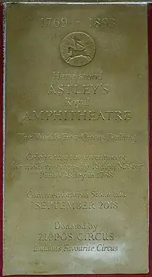 Astley did not invent trick-riding, which was already a popular entertainment of the period. Nor did he originate the idea of performing in a circular 'ring'. The use of the circular arena is successful for two reasons. First, it is easier for the audience to keep the riders in sight. Second, the circular ring (though Astley called it 'the Ride') helps riders through the generation of centrifugal force, which assists them in keeping their balance while standing on the backs of their galloping horses. Astley never called his 'Astley's Amphitheatre of Equestrian Arts' a circus; that title was thought up by Charles Dibdin, who in partnership with Astley's rival Charles Hughes, opened the Royal Circus on 4 November 1782, a short distance from Astley's in Lambeth, London.[4][10] After a few years, Astley added a platform, seats, and a roof to his ring. Even after his death Astley's "Royal Amphitheatre" remained famous throughout the nineteenth century, being mentioned by Charles Dickens and Jane Austen.[11][12] It was closed in 1893 and was demolished the next year. The garden of St Thomas's Hospital now occupies the site; a commemorative paving stone (see below) marks the Amphitheatre's former position.