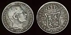 The twenty-centavo coin for the Philippines was introduced in the time of Queen Isabel II of Spain. The coin was not abundant in number until 1868, where more than 1 million coins were made, and 1868 became a common year minted on the twenty-centavo coin.[1] King Alfonso XII of Spain continued the minted of the coin during 1880 to 1885.[2]