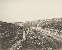 As early as the Crimean War in the mid-19th century, photographers were using the novel technology of the glass plate camera to record images of British soldiers in the field. As a result, they had to deal with not only war conditions, but their pictures often required long shutter speeds, and they had to prepare each plate before taking the shot and develop it immediately after. This led to, for example, Roger Fenton traveling around in a transportable dark room, which at times made him a target of the enemy. These technological barriers are why he was unable to obtain any direct images of the action.[5]