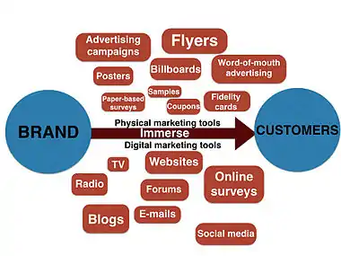 The term immersion marketing or immersive marketing includes traditional advertising, public relations, word-of-mouth advertising, digital marketing, samples, coupons, retail partnerships and other ways of surrounding the consumer with a consistent message about a brand.[1][2][3] In essence, immersion marketing envelopes a brand or product or company issue so that the marketing, advertising, and public relations departments or representatives work holistically towards delivering the same brand message across multiple distribution channels. Unlike "Shotgun marketing"[4](communicate the message to anyone who listens), immersive marketing is cheaper and more effective, focusing directly on the customer's needs.