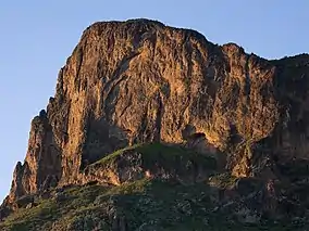 The place name Picacho Peak is etymologically redundant: picacho means 'peak' in Spanish. In 1775 the peak was referred to as Cerro de Taca 'Taca Hill' by Father Francisco Garcés, using the Oʼodham name Tcacca or Taceo. It was also called Picacho del Tucson 'Tucson Peak' in the past.[2][3]